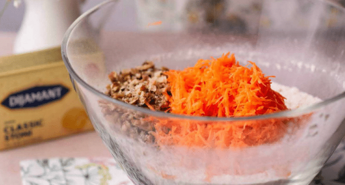 U činiji sjedinite mokre sastojke, jaja, istopljen margarin i jogurt. U drugoj činiji sjedinite suve sastojke, brašno, prašak za pecivo, šećere i začine. Sjedinite dvije smjese uz pomoć spatule pa dodajte šargarepu i sitno sjeckane orahe i promiješajte.